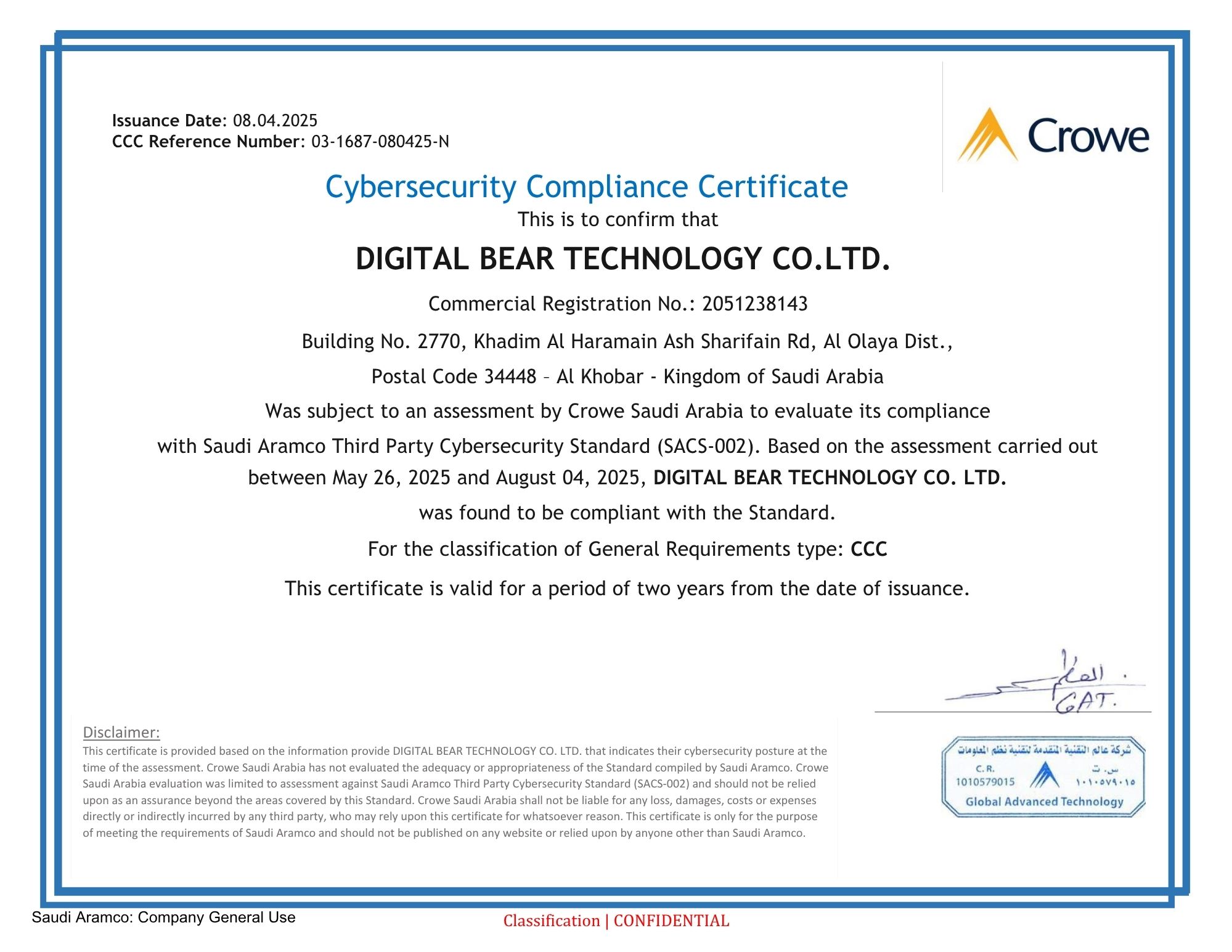 (Cybersecurity Compliance Certificate)